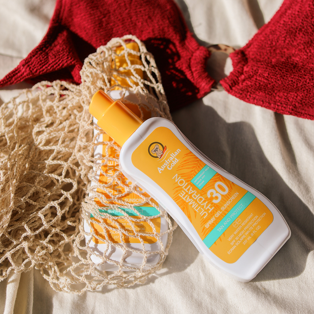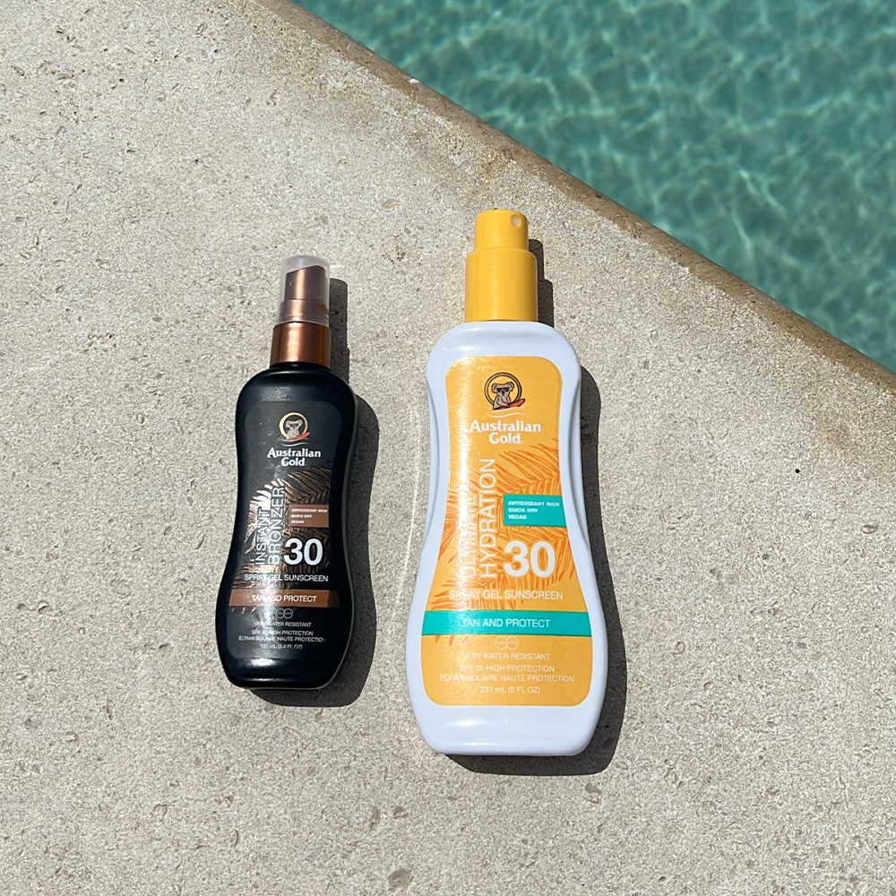 Alle Australian Gold LSF Sonnensprays in den hellen (weißen) Tuben sind hochwertige Sonnensprays ohne zusätzliche Bronzer. Das Australian Gold LSF 30 Spray Gel Sonnenspray schützt perfekt vor UVA und UVB und zieht schnell in die Haut ein. Enthält Kakadu Pflaume (reich an Vitamin C), Aloe Vera, Vitamin E, australisches Teebaumöl und Sonnenblumenkernextrakte, so dass deine Haut nicht nur gut geschützt, sondern auch hervorragend gepflegt ist. Klebt nicht, fettet nicht, schweiß- und wasserabweisend. 237 ml Flaschen und ein toller Duft!